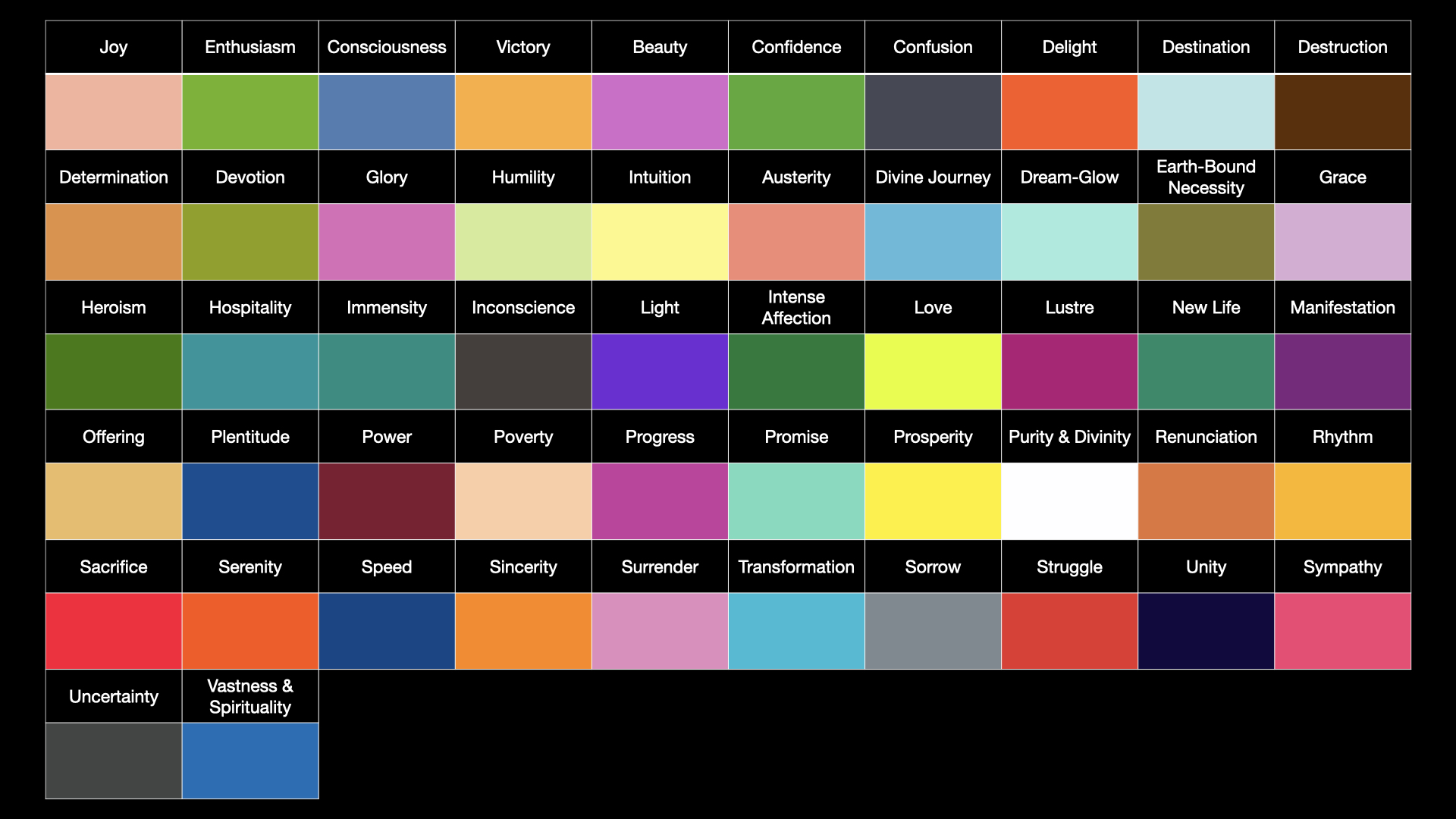 Here are all 52 colors and their spiritual qualities and described by Sri Chinmoy.